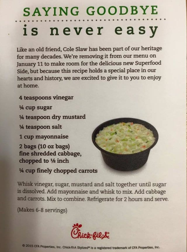 One of my favorite restaurant side dishes ever, Chick-fil-A coleslaw, was taken off the menu a few years ago.