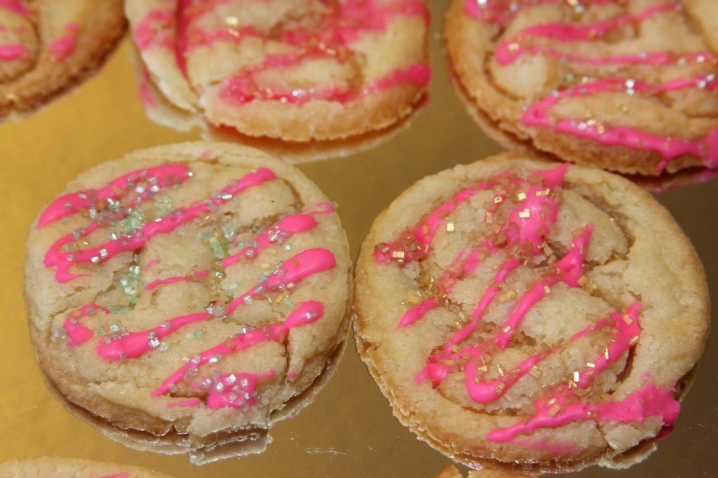 - Let cool then pipe a circle of pink incing in the middle of each cookie and immediately add a pink round candy on top.