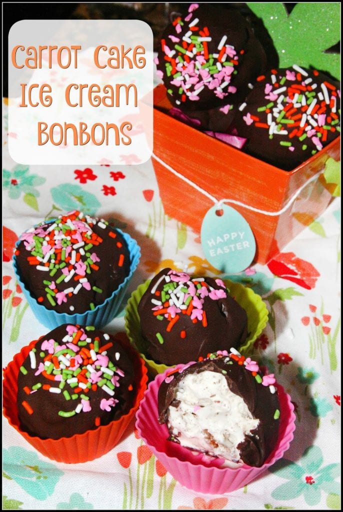 Yesterday I shared my recipe for No Churn Carrot Cake Ice Cream and today I used that delicious ice cream, dipped it in chocolate, and made bonbons. These little balls of deliciousness are the perfect Easter treat to serve your little ones after Easter egg hunting this weekend!
