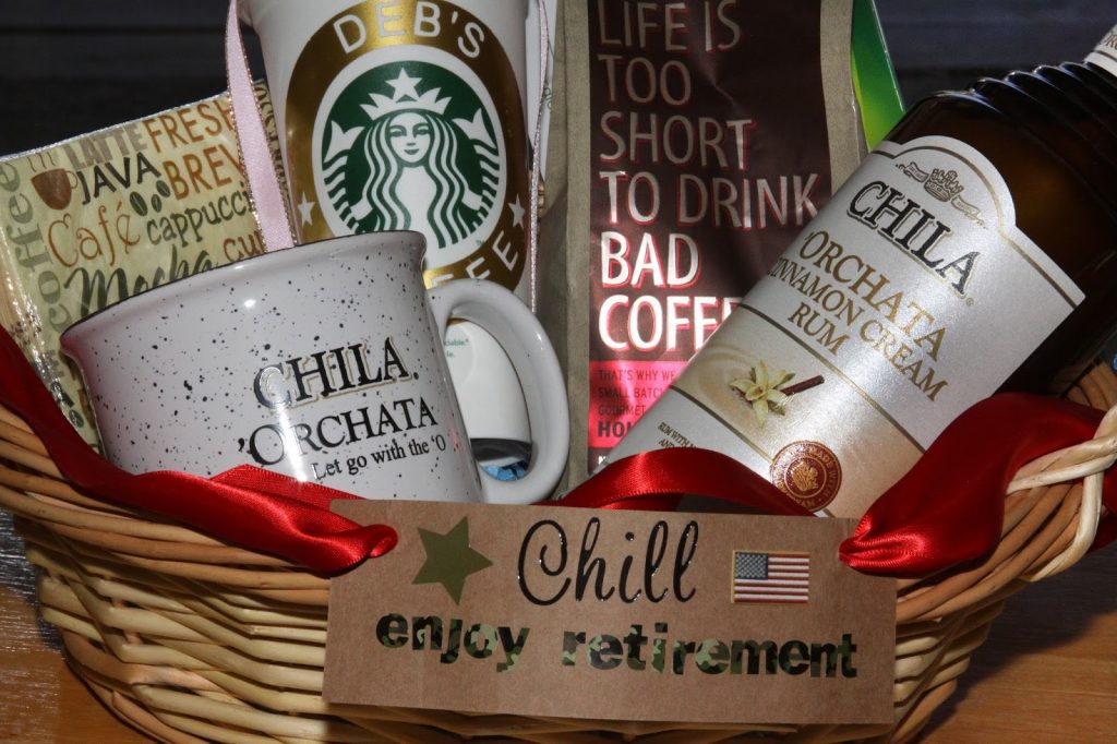 like this retirement basket for Ashton’s First Sargent, I include a bottle of Chila ‘Orchata as a gift.