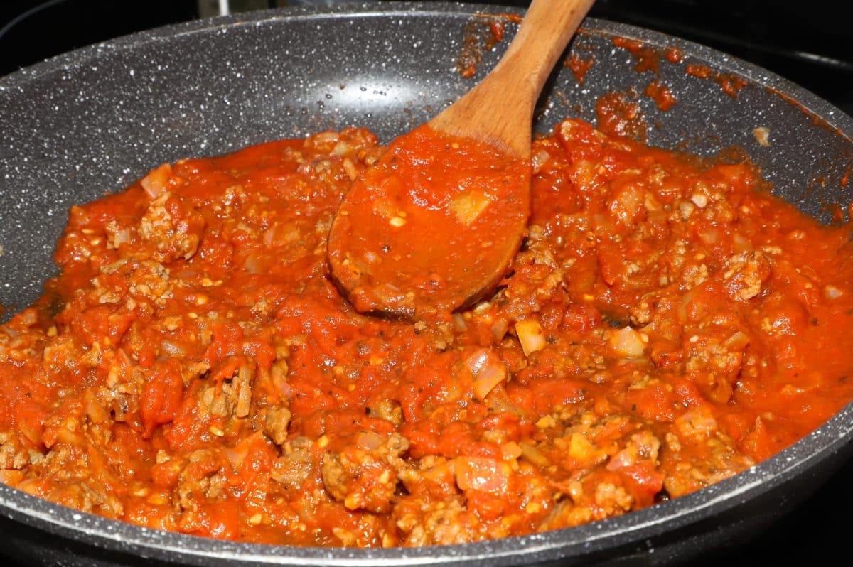- Drain then add in cooked onion mixture, 1/2 tsp Italian seasoning, and one jar of marinara sauce. Stir.