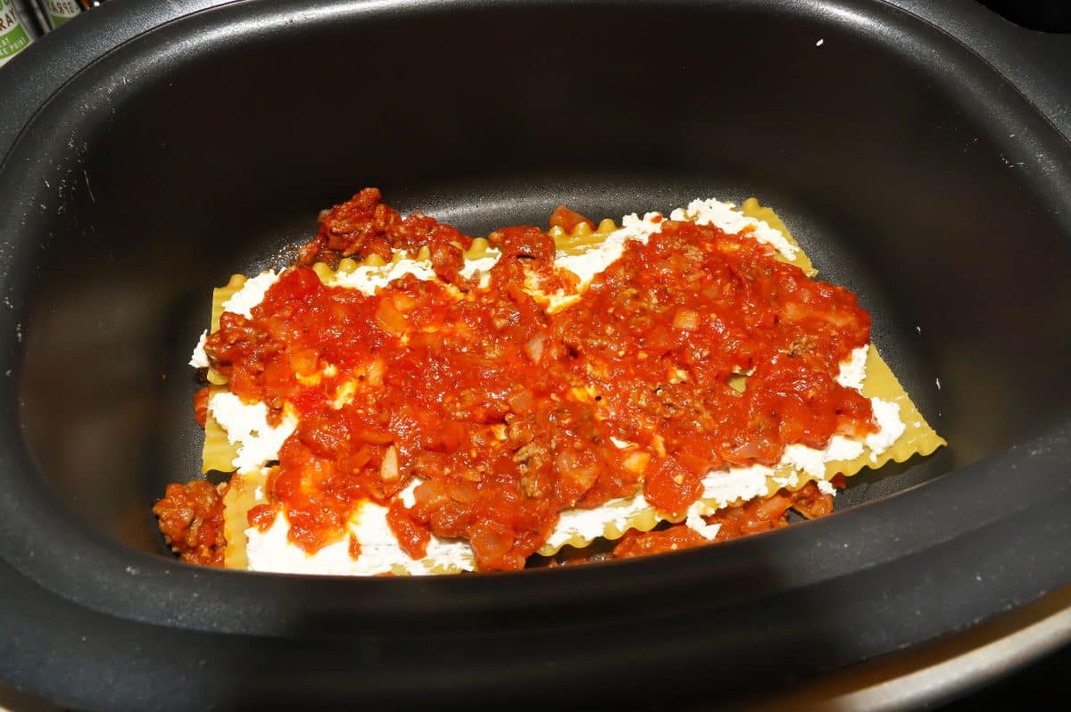 - Add a row of lasagna noodles, 3 or 4 depending on the size of your Crock-Pot.
