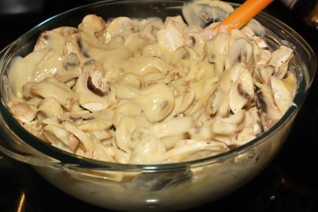 - Cover the chicken with the soup and mushroom mixture.