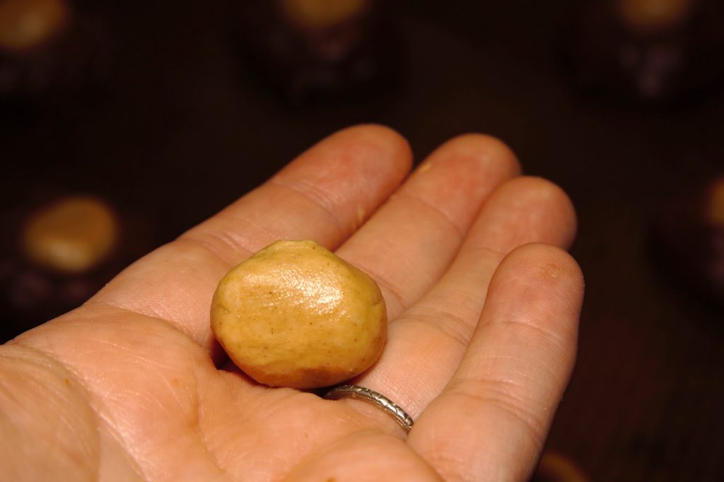 - Using a small spoon or a melon baller scoop out balls of peanut butter and roll into balls in your hand.