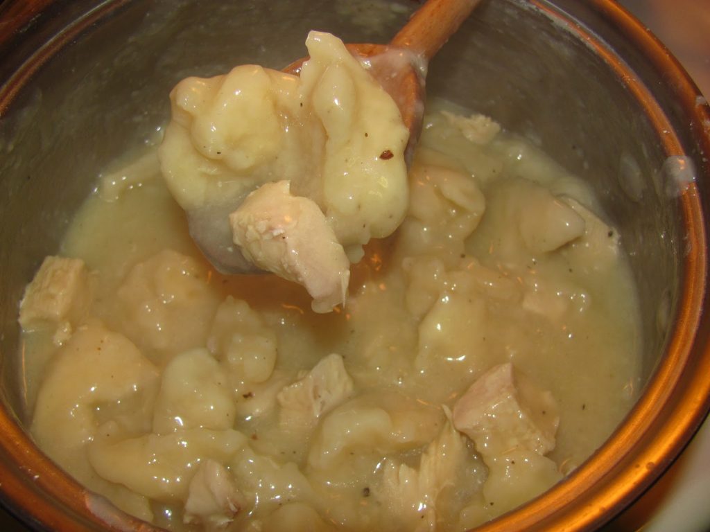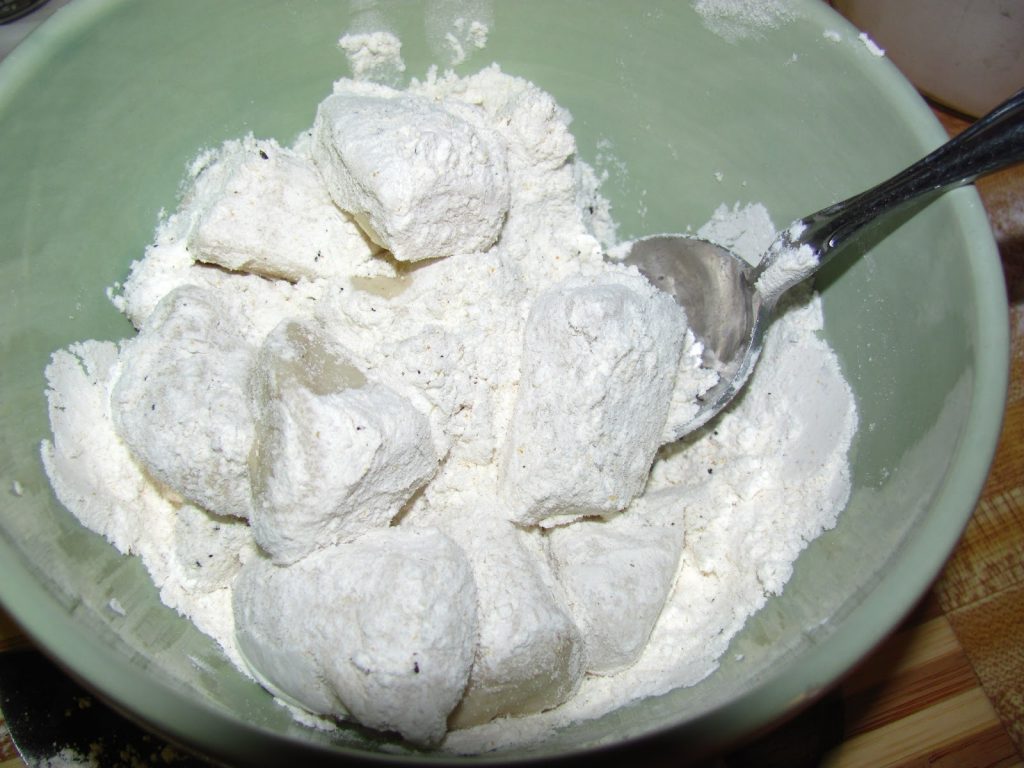 - Coat the dumpling pieces in the seasoned flour and drop into the simmering broth.