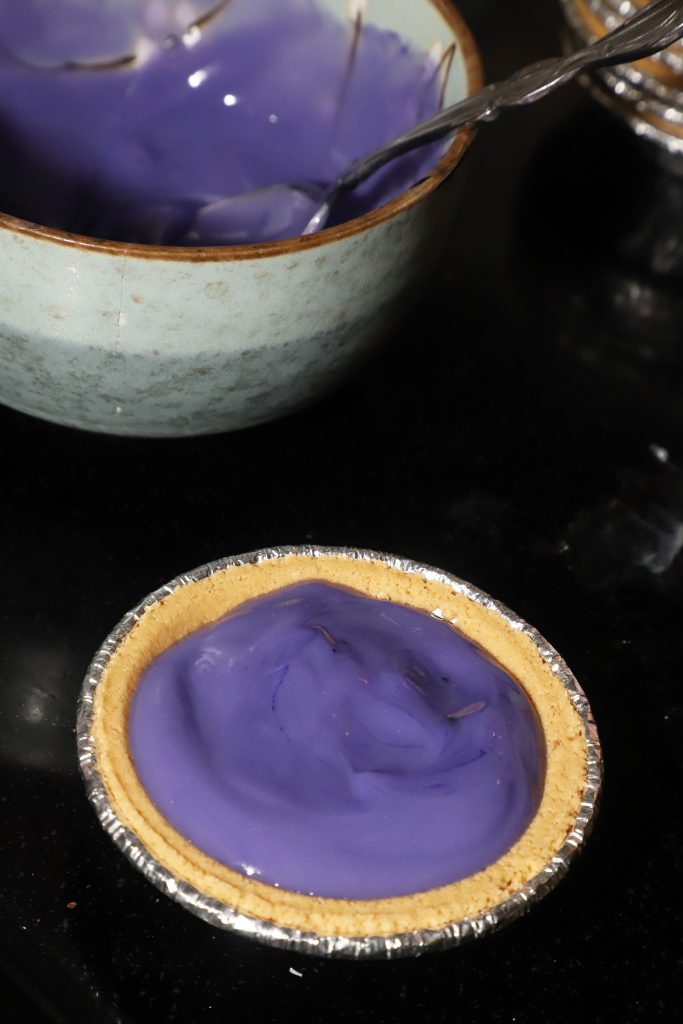 - Place the pie crusts on a baking sheet and spoon in the colored pudding. You should have three purple and three orange.