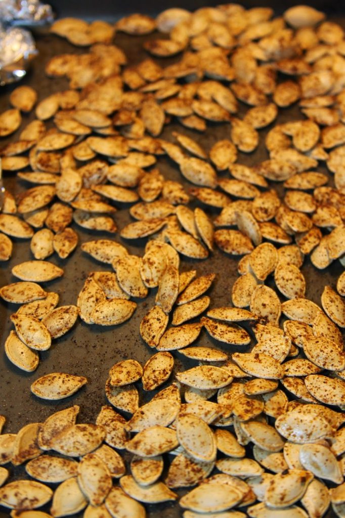 Since she’s a minion lover her Daddy made her the coolest minion pumpkin ever (using a picture he found on Pinterest). So we sipped apple cider (another hit with Ava), ate cookies, danced to music, and after Ashton was done cleaning out Mr Minion Pumpkin, we roasted the pumpkin seeds. I seasoned them two ways: savory with Bacon Salt and sweet with Cinnamon Sugar.