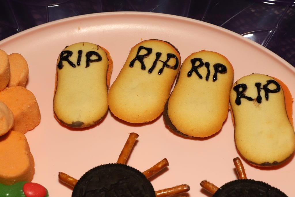 - 1 plate of Milano cookies made into tombstones, Oreo cookie spiders, sliced fruit such as green apples and kiwi, and pumpkin marshmallows.