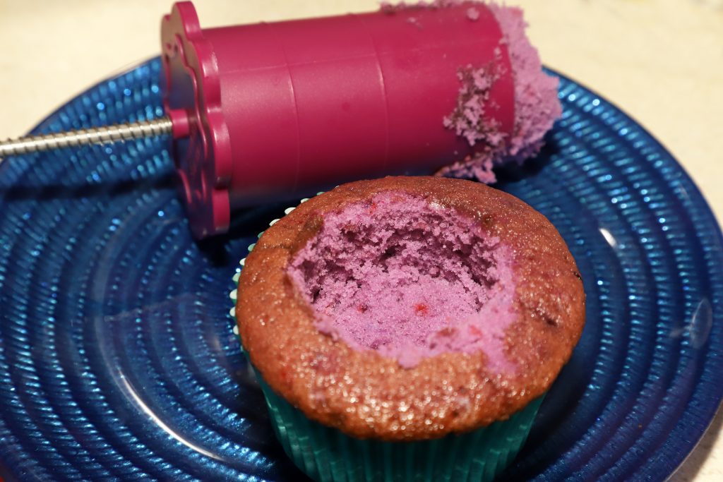 - Using a butter knife or a cupcake corer, carefully cut out a circle in the center of each cupcake. Do not poke all the way through to the bottom. Save the cut out pieces.