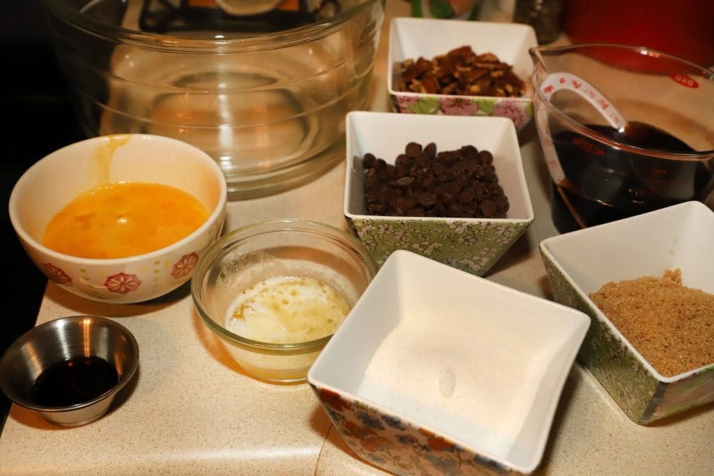 • Mix all pie ingredients together in a bowl except pecans and chocolate. Stir well.