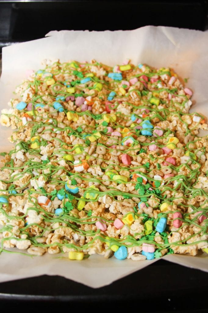 This shimmering gold popcorn is tossed with Lucky Charms cereal and drizzled in green chocolate. It is a crunchy and sweet snack, perfect for making with the kiddos on St Paddy’s Day!