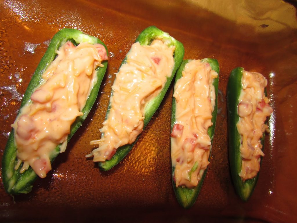 - Fill cored jalapenos with the pimento cheese spread.