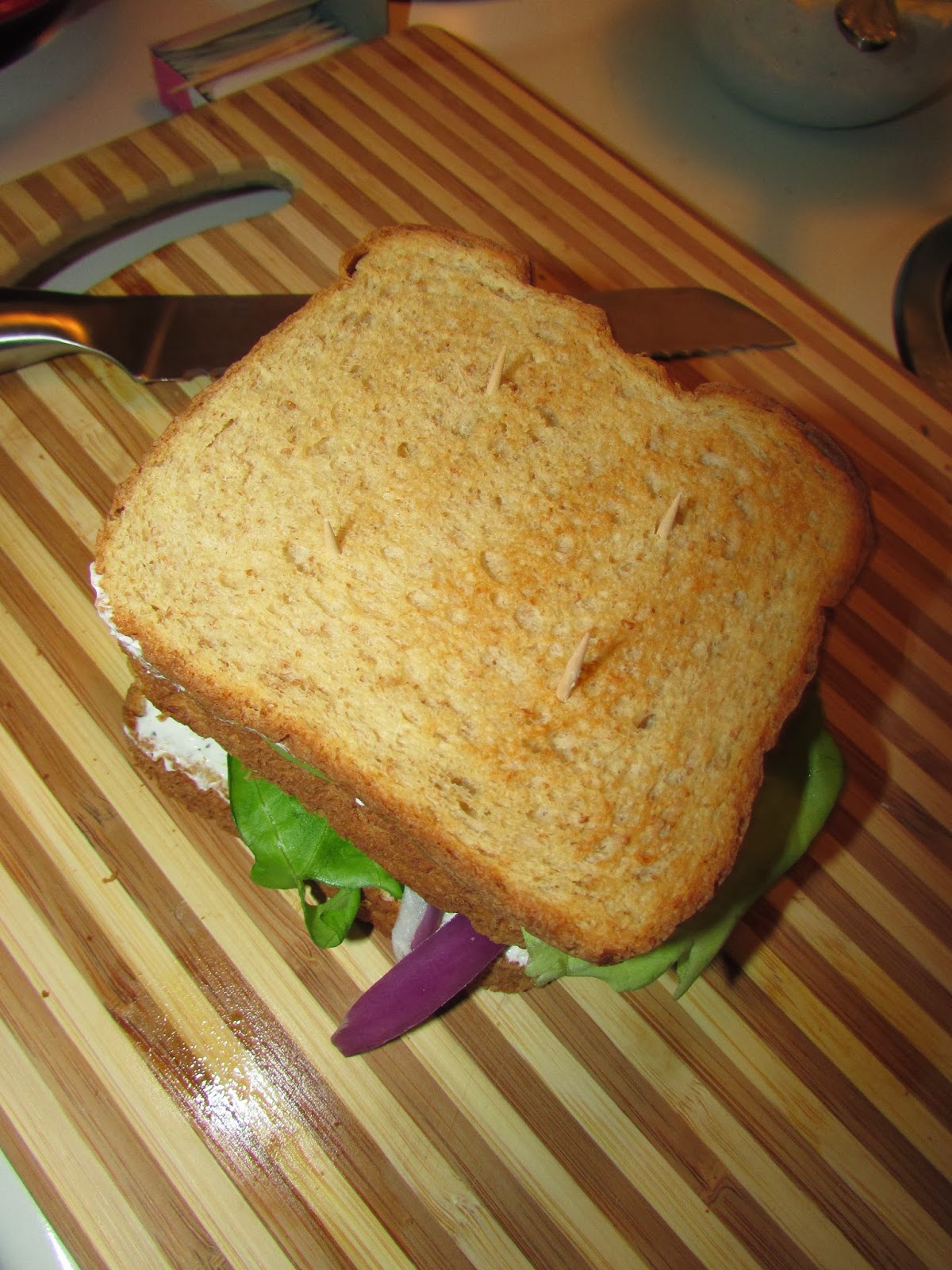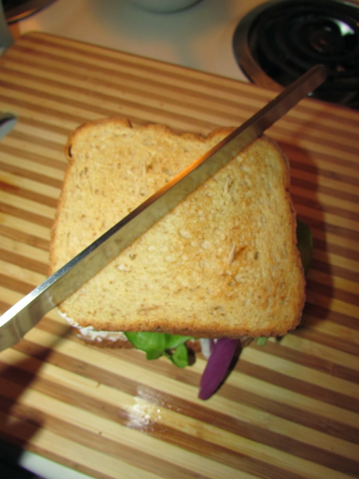 How to cut the sandwich: 4 toothpicks in all 4 sections then slice across (in a triangle) then across once more until you have 4 stacked triangles.