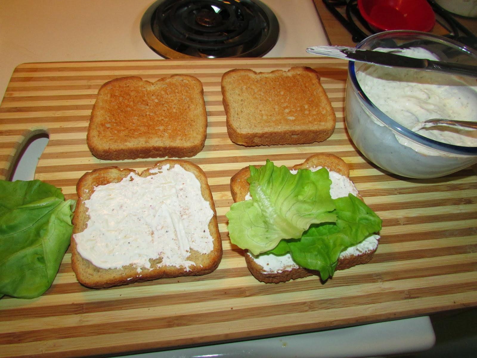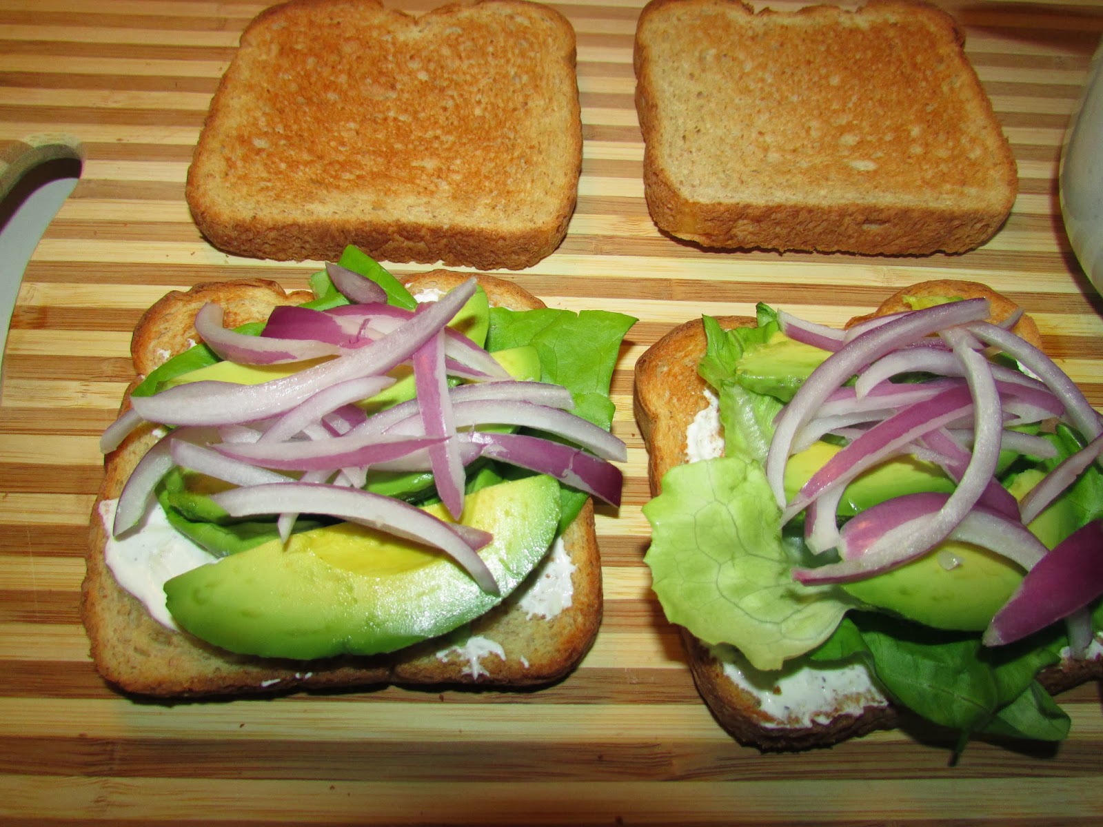 - Top with lettuce, then avocado slices, then onions, then another piece of toasted bread.