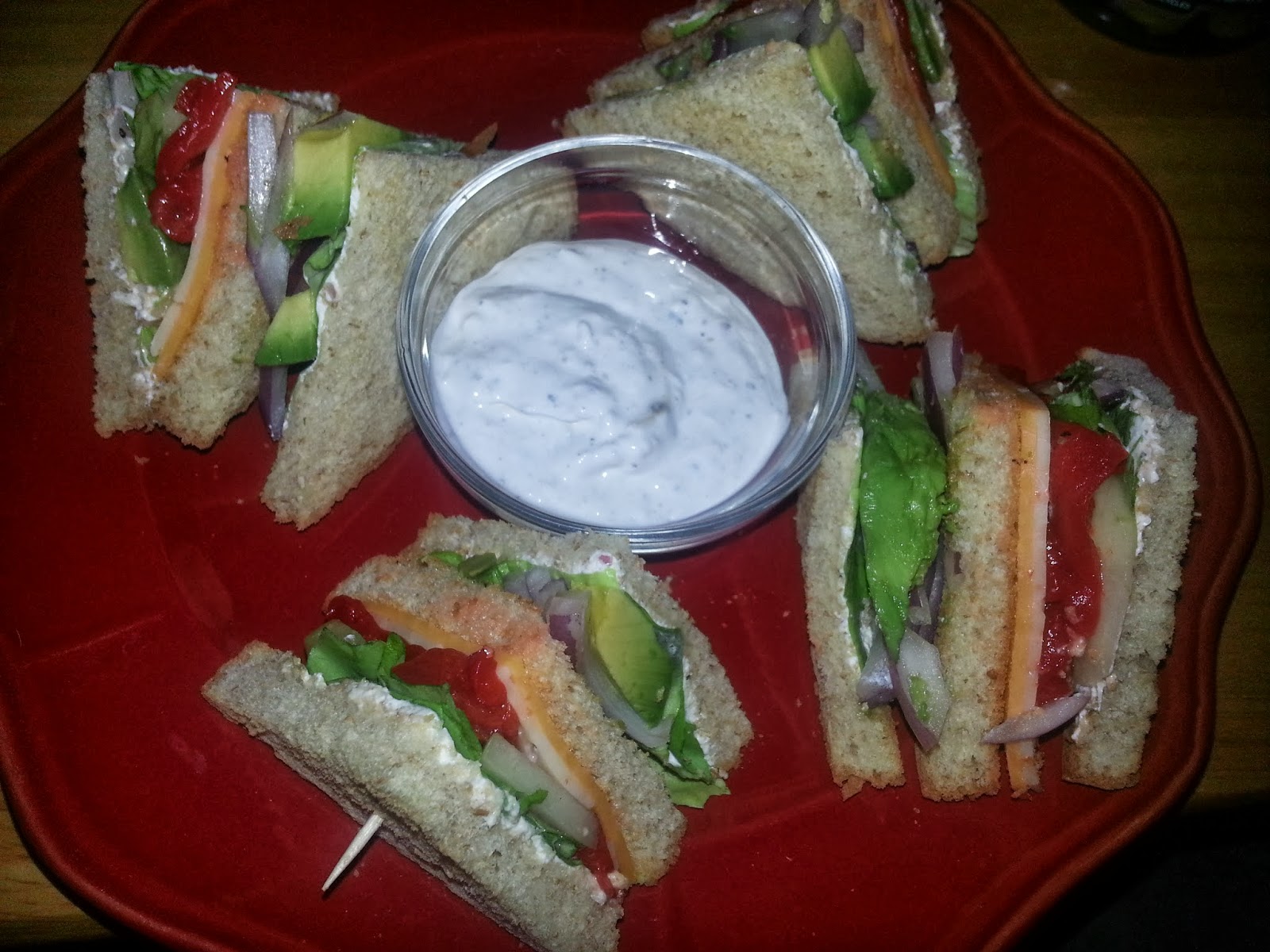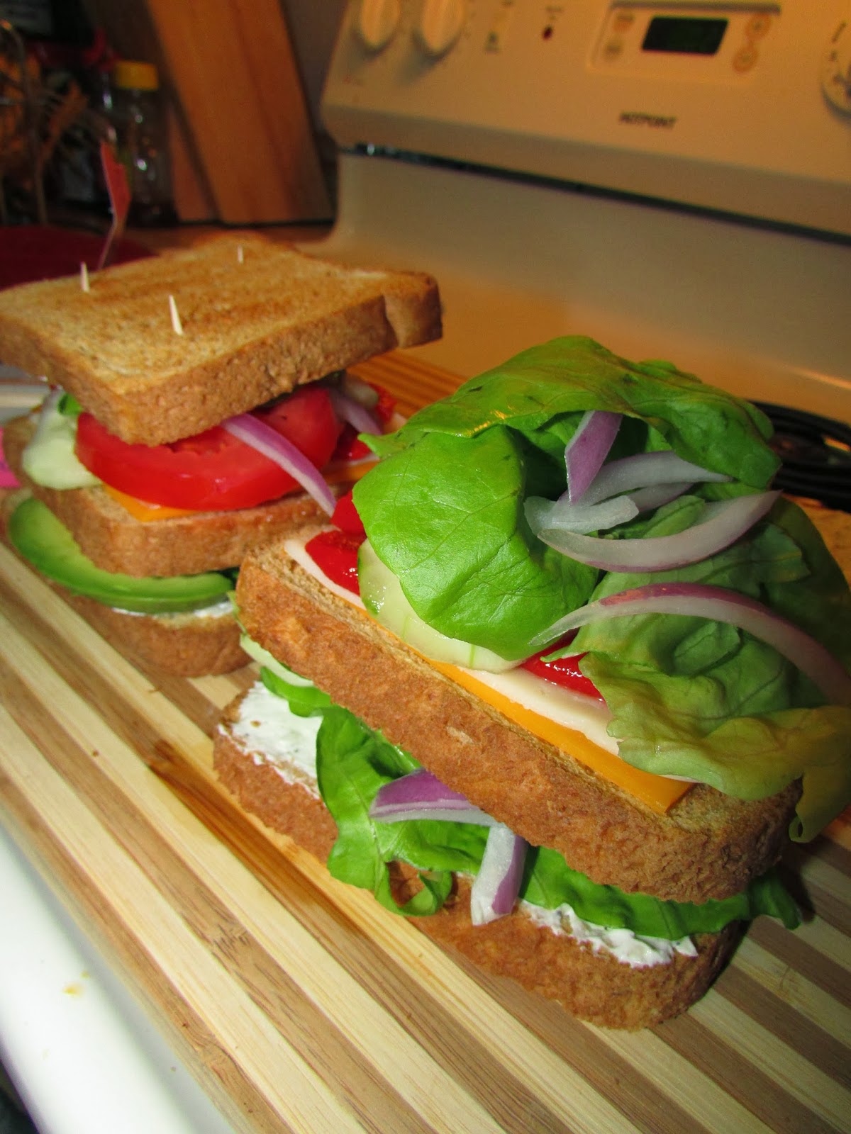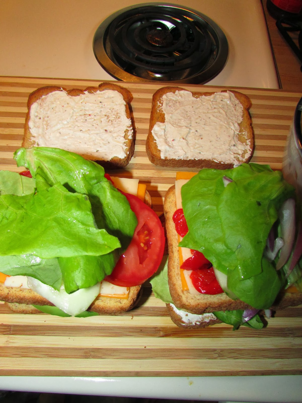 To assemble: dressing, then lettuce, avocado, onion, bread, cheese, roasted red peppers, lettuce, tomato, onions, dressing , and bread!