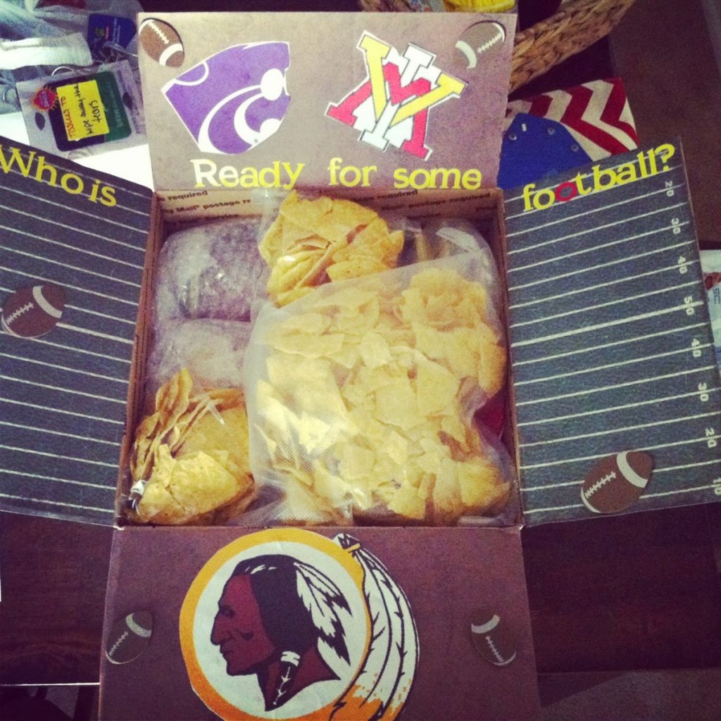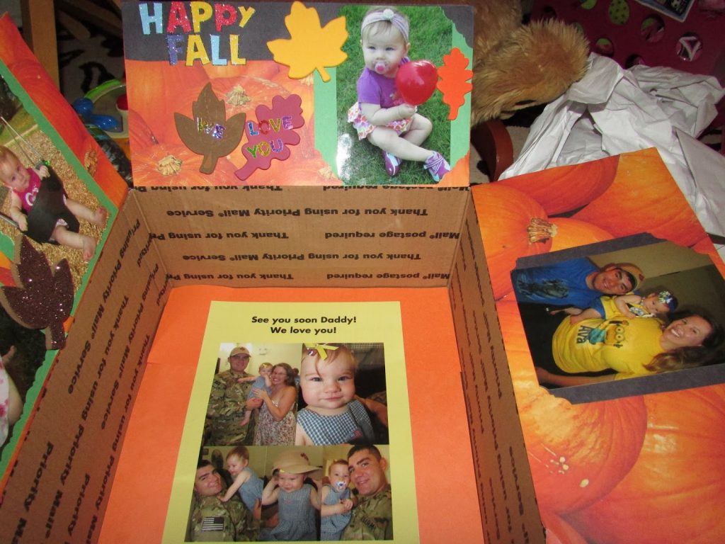 I thought this would be a good time to share some Deployment Care Package Ideas with all of you! When Ashton was deployed Ava and I liked to decorate themed boxes to mail him once or twice a week. They were filled with snacks, magazines, toiletries, pictures, cards, etc and just helped him to have some things from home with him and to see how much we missed him here! I even hosted a few Care Package Parties for our local FRG spouses to pack up boxes together! It really is a fun project to do with fellow military wives and/or family members!