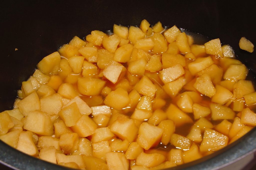 Lower head to medium low and simmer for 30 – 35 minutes with the lid slightly ajar. Cook until the apples are soft, stirring often.