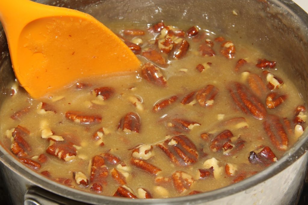 - Stir until it becomes creamy and cloudy, and pecans stay suspended in mixture {about 240 degrees}.