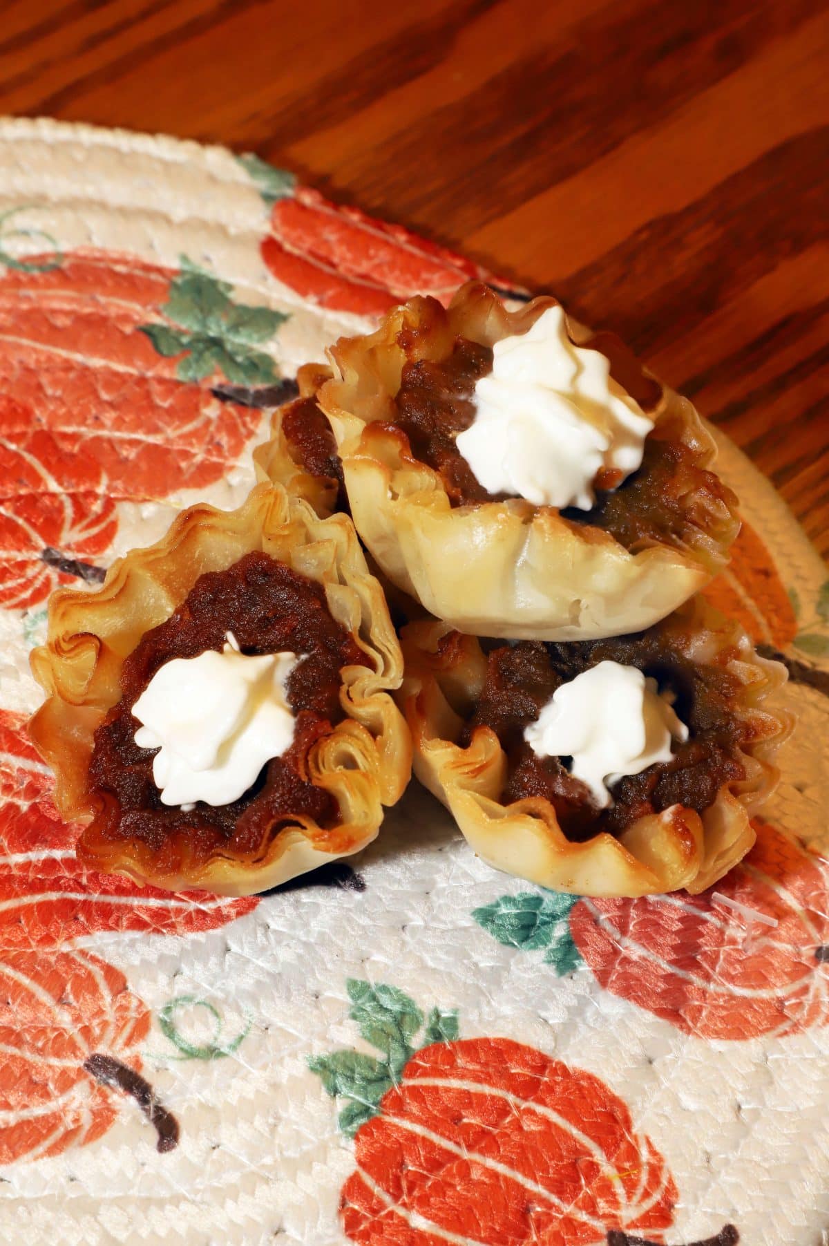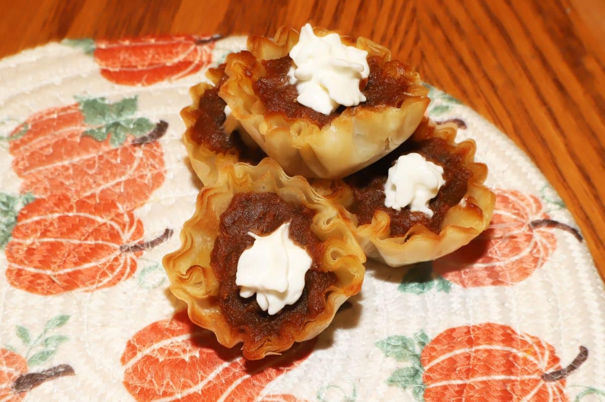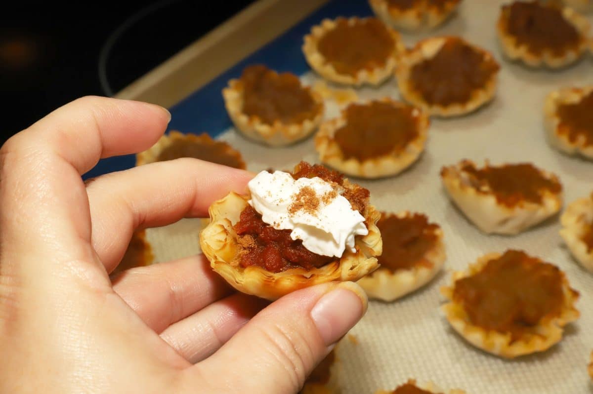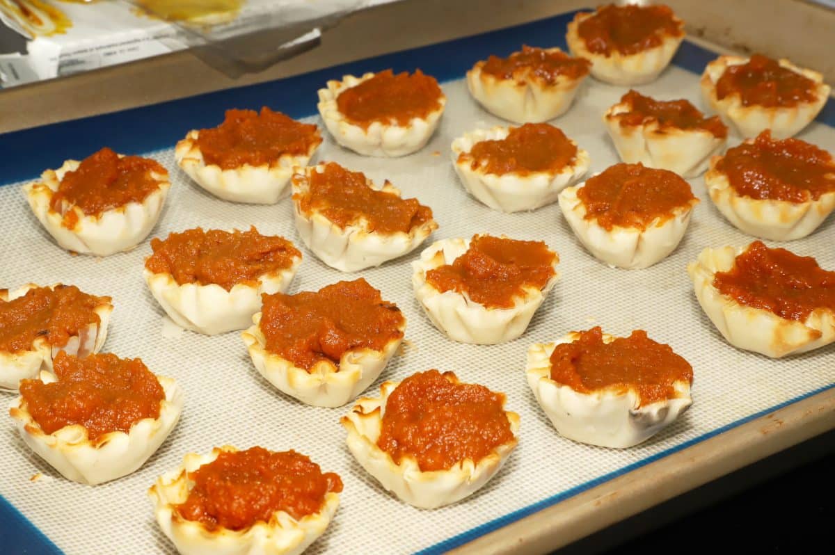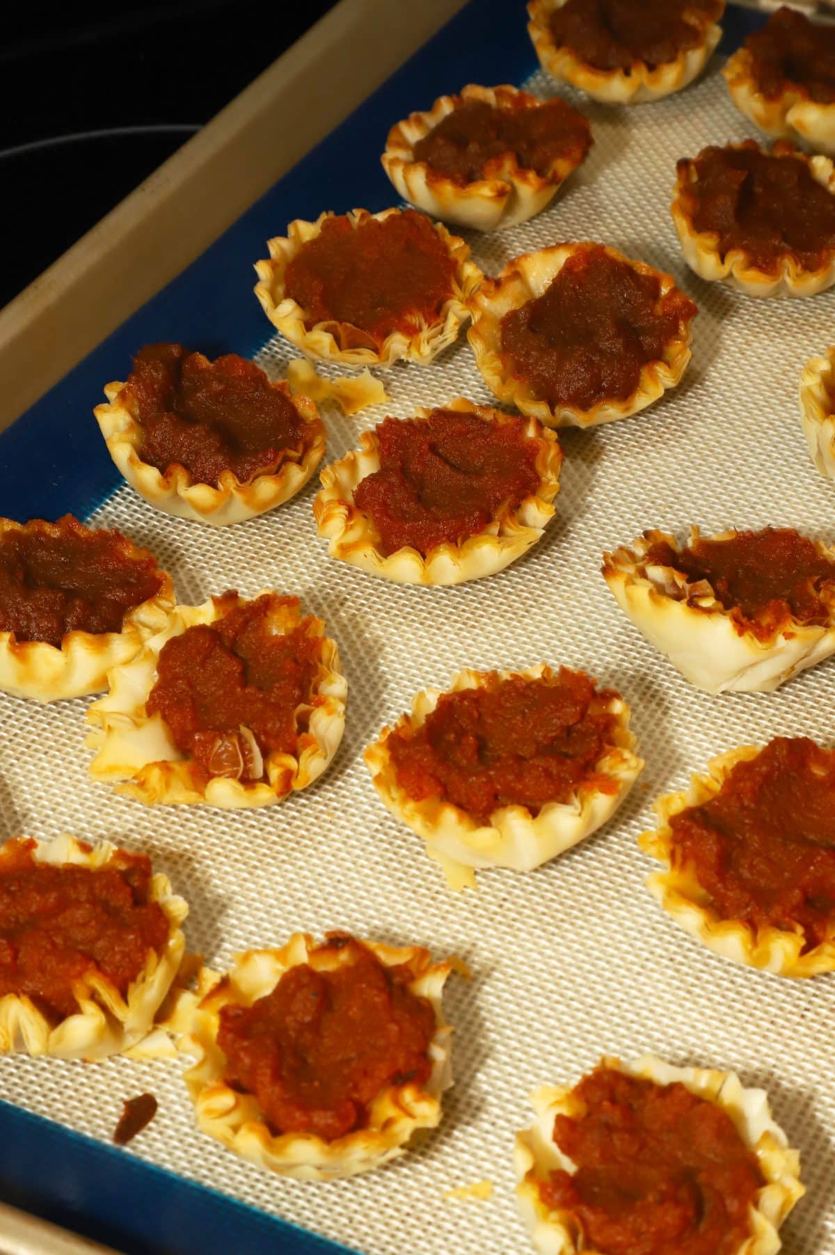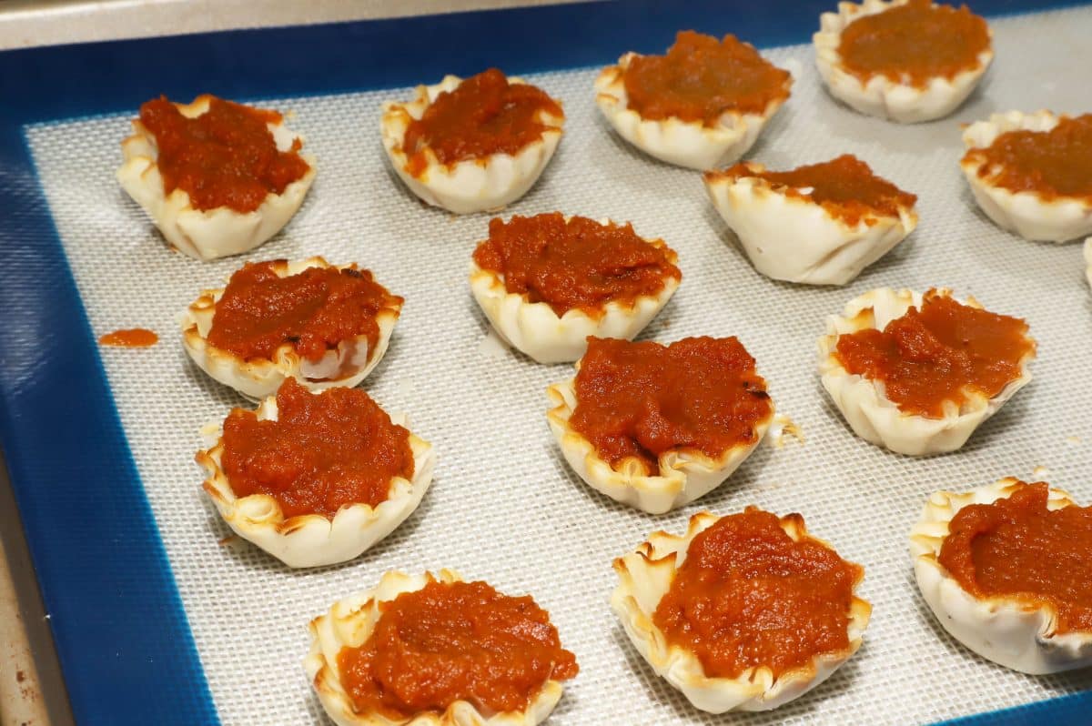 - Add a large spoonful of pumpkin filling in the center of each pie tart.