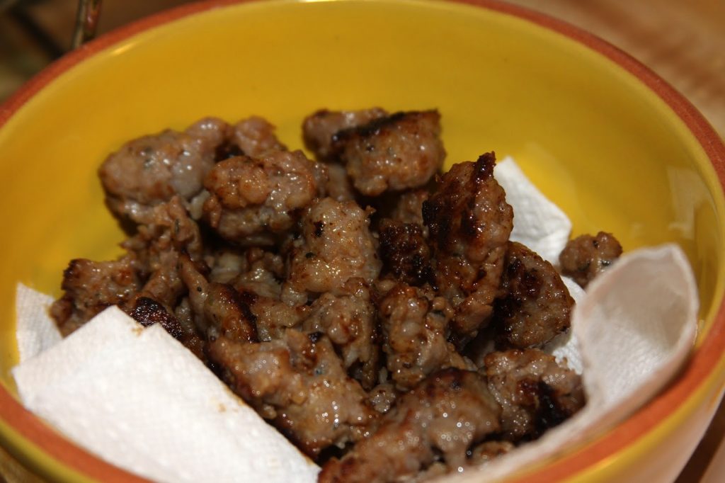 Remove sausage from the casings and crumble in a skillet.