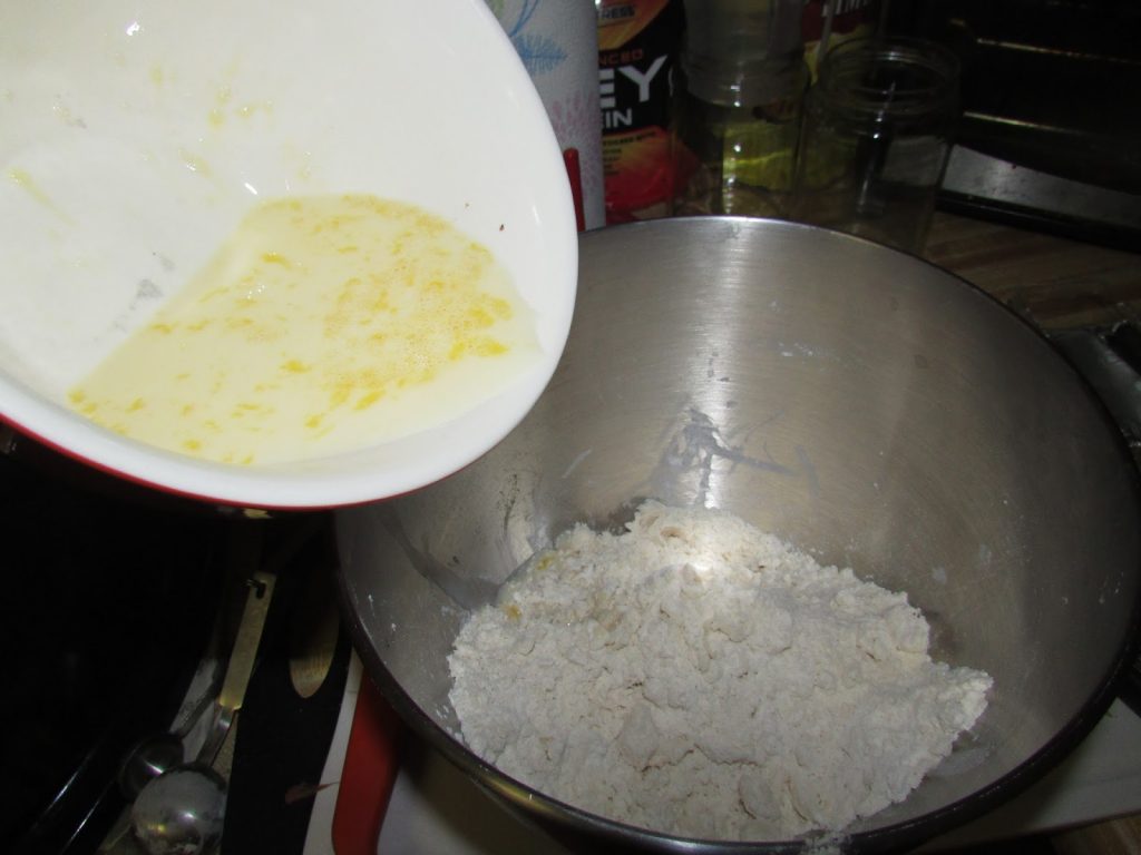 - Beat egg and milk together. Pour into flour mixture and stir with a fork until just combined.