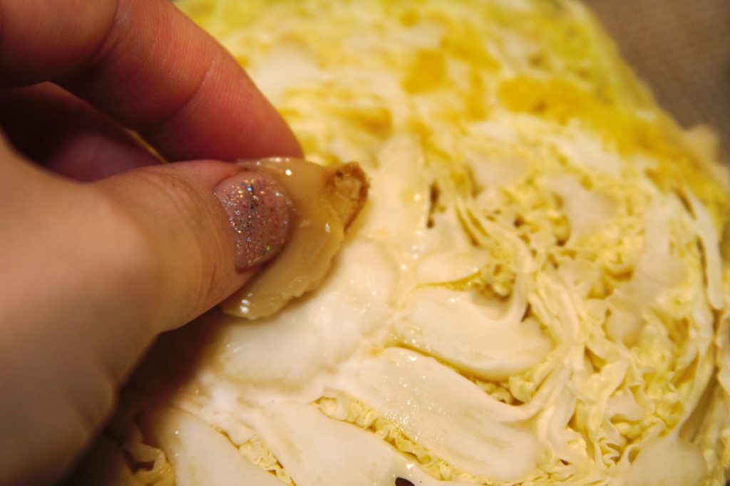 - Rub roasted garlic cloves on both sides of the cabbage slices then place on the baking sheet.