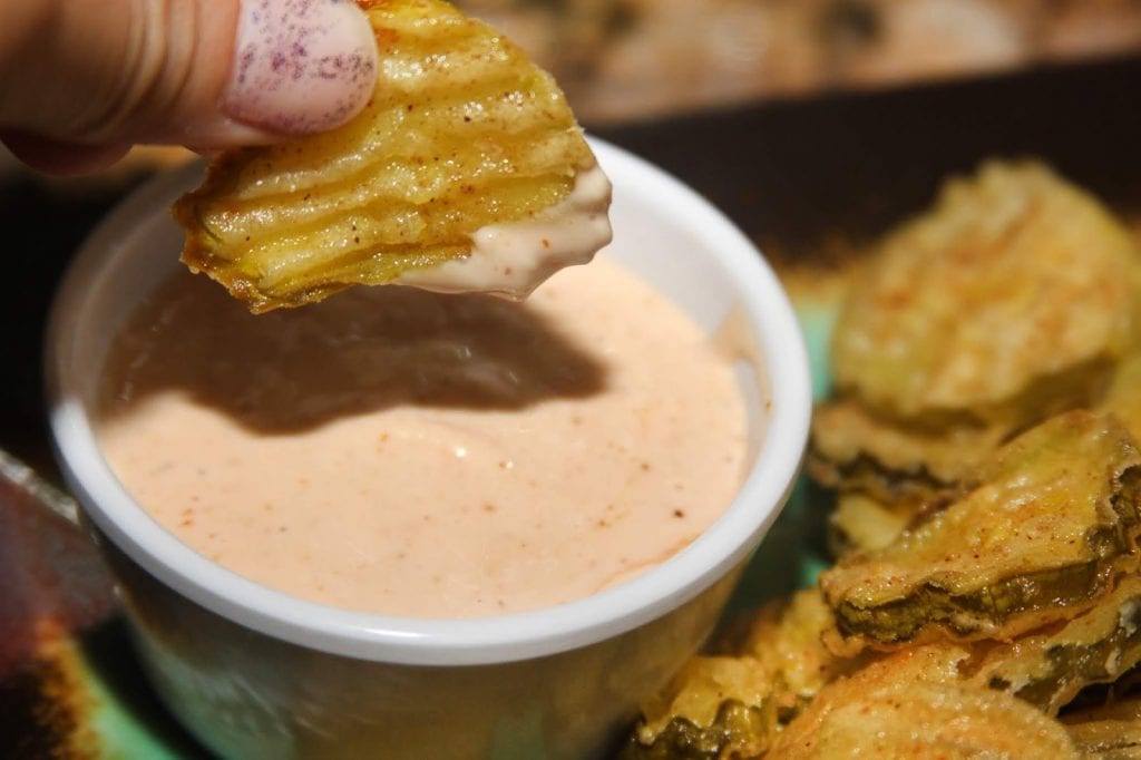 I serve my fried pickles with ranch dip or this Cajun sauce made with ketchup, horseradish, mayo, and Cajun seasoning.