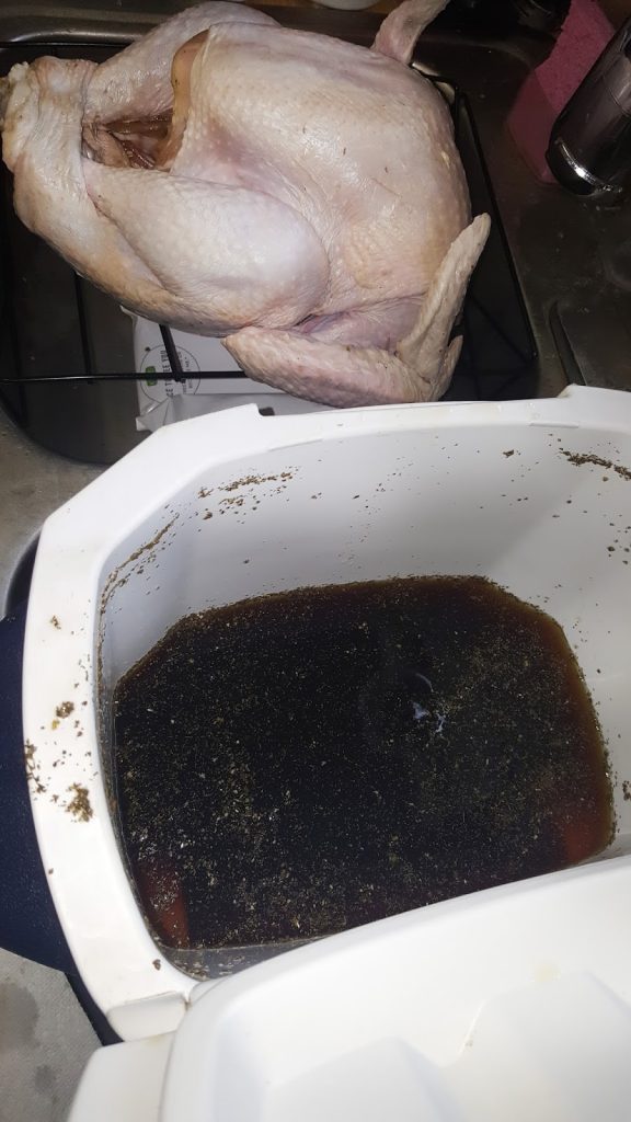 Add the rinsed turkey to the brining mixture and let sit in the fridge overnight.