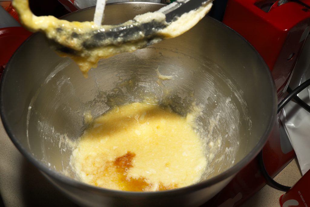 - Add one egg at a time and then vanilla and continue to mix.