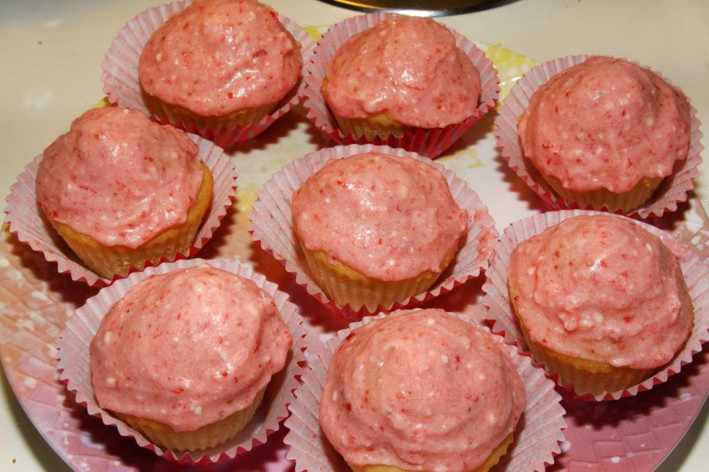 Once the cupcakes are cooled, frost generously with the strawberry frosting.