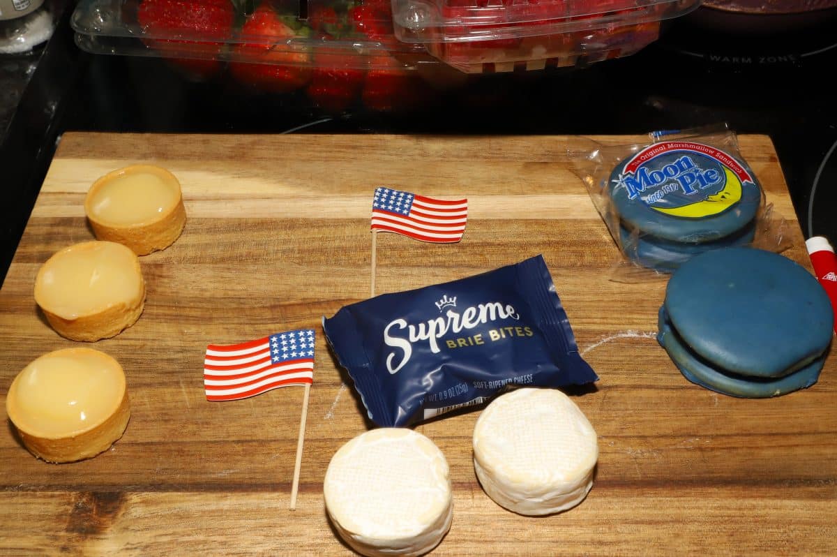 Now start preparing our treats. I using mini brie circles with flag toothpicks, blonde Oreo “medals”, cheesecake tarts topped with fruit ( recipe here) , patriotic truffles, and a blue mini moon pie.