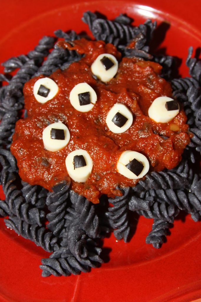 I used gluten free black bean pasta from Trader Joe’s and made eye balls with cut up cheese sticks and olives.